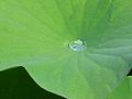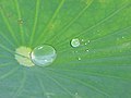 Auf den Lotusblättern bilden sich silbrig glänzende Regentropfen (Bildmitte), die Blätter der normalen Seerose (unterer Bildrand) werden komplett vom Wasser benetzt. -